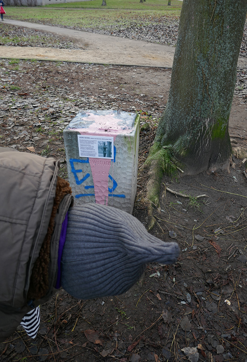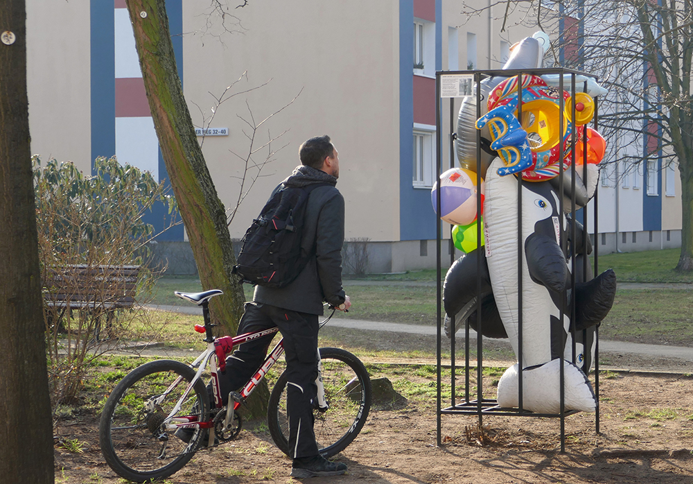 Viele Anwohner fragen uns, ob wir die Figur Schwimmer zurückbringen. Wir erklären, dass wir im Rahmen des Wettbewerbes eingeladen sind für sechs Monate eine temporäre Arbeit aufzustellen. Wir fragen nach, als wie sicher die Anwohner den Ort empfinden. Der Ort wird als unsicher beschrieben. Die Menschen wirken auf uns im Gegensatz dazu sehr interessiert, offen und freundlich. Wir stellen fest, dass viele Personen hier täglich vorbei gehen, alle Altersgruppen vertreten sind. Fast alle wissen, dass hier die Figur Schwimmer stand und das sie gestohlen wurde.